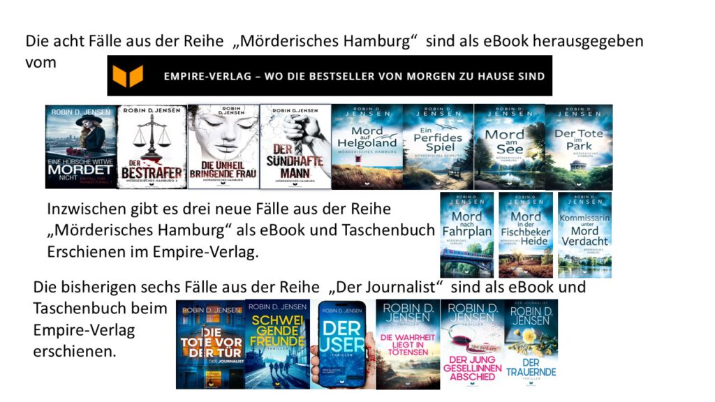 Von mir stammt unter anderem die Krimireihe mit dem Hamburger Kommissar Rainer Zufall. Sie trägt den Titel „Mörderisches Hamburg“. Diese habe ich zunächst als Taschenbuch im Selfpublishing veröffentlicht. Diese wurden mit neuem Cover und neuem Titel vom Empire-Verlag als eBooks herausgegeben. Die Serie besteht aus 10 Bänden, die beiden neuesten gibt es auch als Taschenbuch.